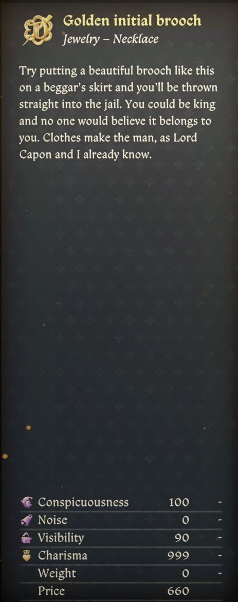 – It increases the Charisma value of one specific brooch to a very high number.